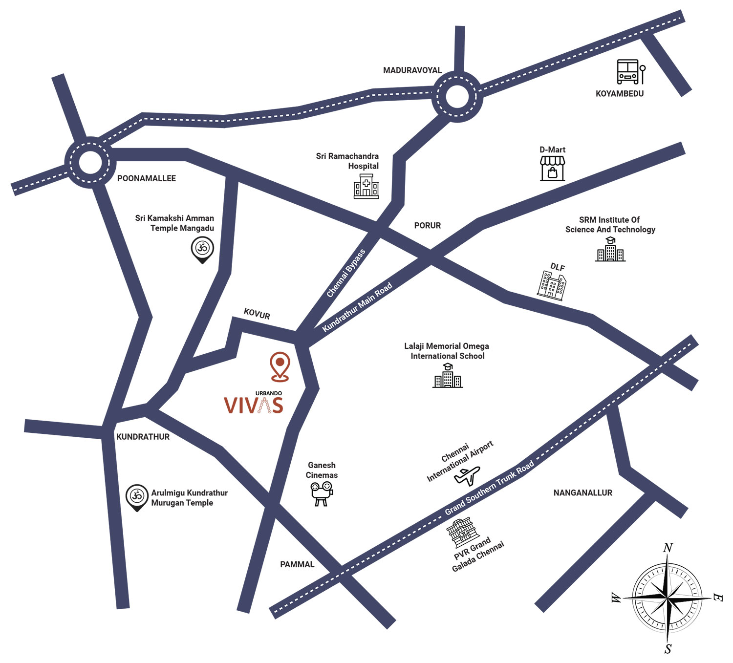 Vivas is a distinguished residential plot project situated in Swaminathan Nagar Phase 2, Kovur. This develoment offers plots ranging from 750 to 1104 sqft, providing a prime opportunity for individuals and families to construct their ideal homes. Nestled in a serene environment, Vivas seamlessly blends the tranquility of suburban life with convenient access to urban amenities.